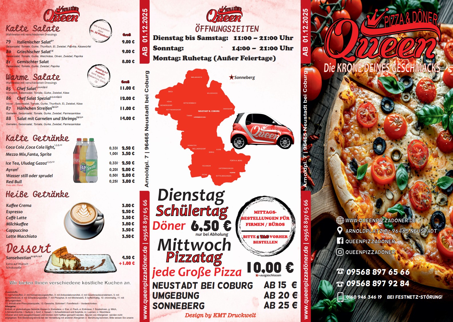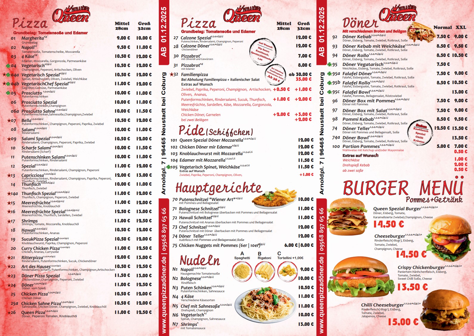 Willkommen bei Queen Pizza Döner, Ihrem erstklassigen Imbiss in Neustadt bei Coburg – jetzt auch mit Lieferservice! Unser Geschäft steht für frische Zutaten, köstliche Gerichte und herausragenden Kundenservice. Ob Pizza, Döner oder Salat – bei uns finden Sie alles, was Ihr Herz begehrt, und können sich Ihre Lieblingsspeisen nun bequem nach Hause liefern lassen.